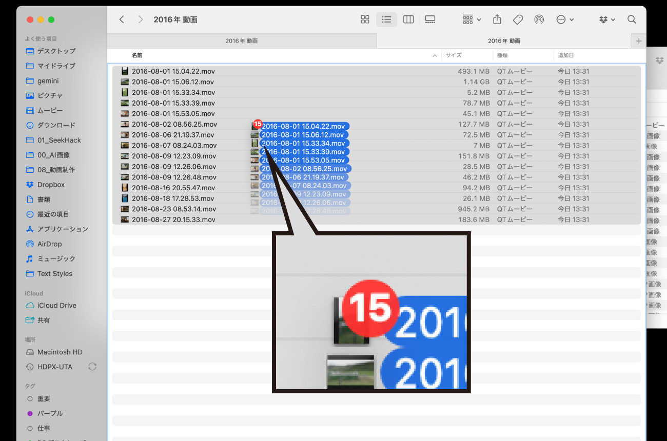 Finderでファイルの数を数える1つ目の方法は、数えたいファイルを選択し、つかんで(ドラッグして)ちょっと動かすだけです。