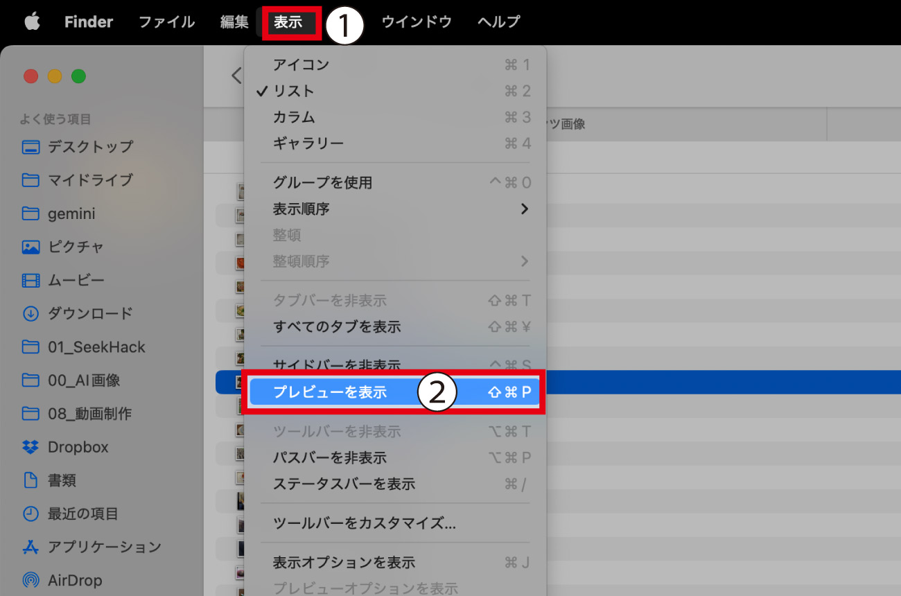 Finderのメニューにある「表示」をクリックし、「プレビューを表示」を選択します。
